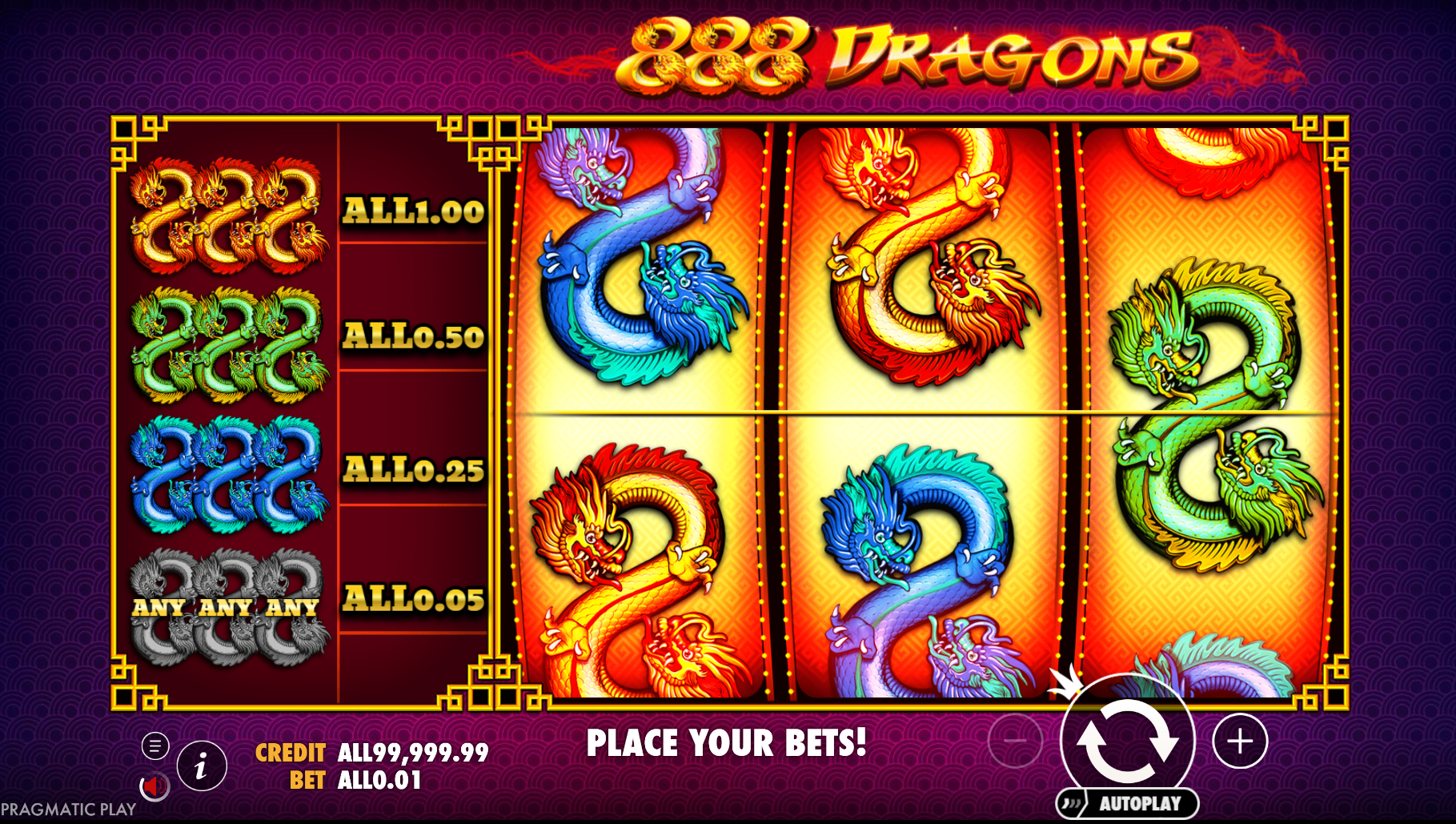 Set against a vibrant violet background, the reels feature three elegant Dragon symbols — red, green, and blue — each forming the number 8, a symbol of good fortune. The Red Dragon offers the highest virtual reward, followed by the Green and Blue dragons. There are no Wild or Scatter icons here — just pure, straightforward spinning fun.